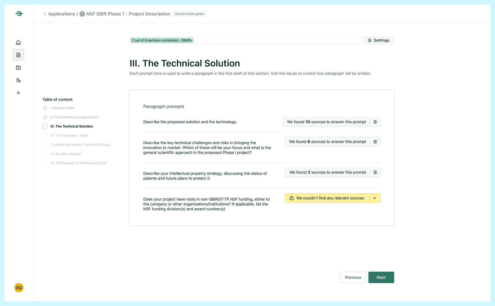 Relevant experience - This will be feature dependent. In our case, this means having applied to and won government grants in the past.
